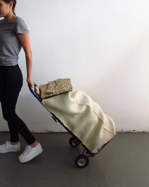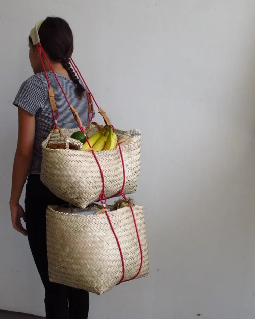 Las piezas están hechas con fibras vegetales duras y semiduras del país, trabajadas con técnicas de cestería o telar de cintura y contrastadas con detalles en vinil de color inspirado en las líneas del metro.